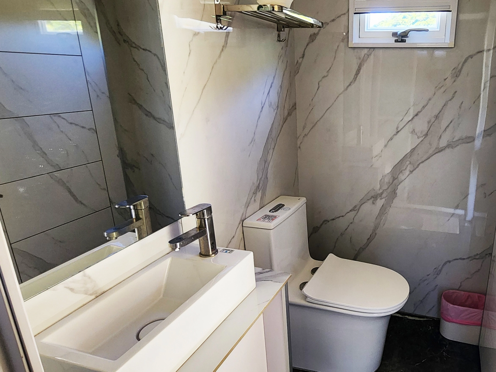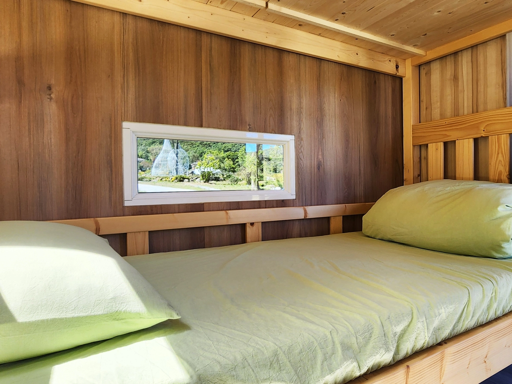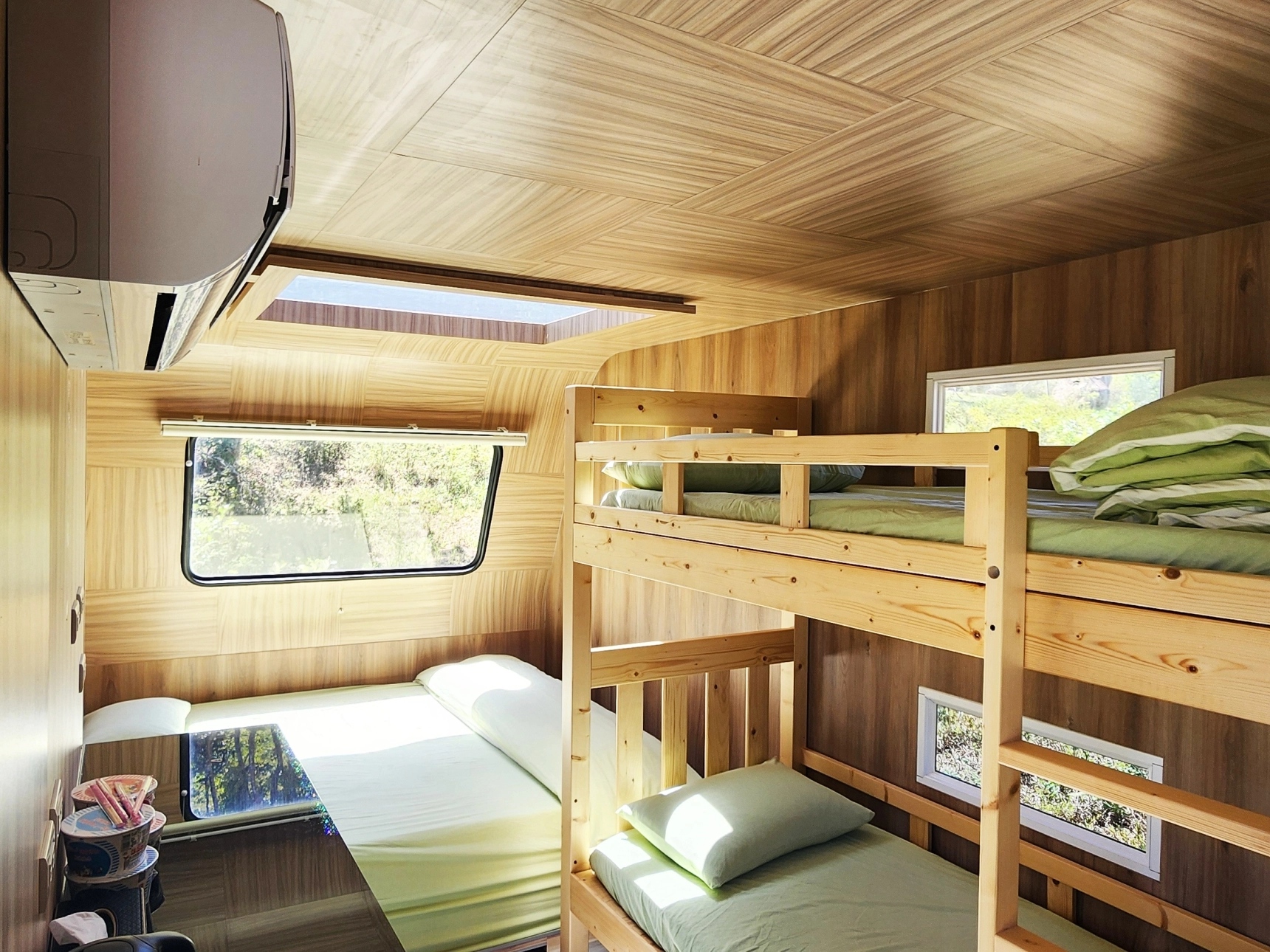 4.住宿配置:一張大床 & 一張上下舖,可供 2 大 2 小入住,獨立衛浴設施、冷氣空調、舒適乳膠墊、全天供應冷熱水。