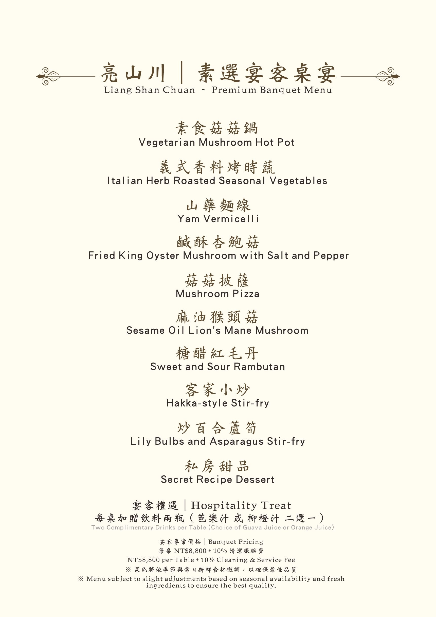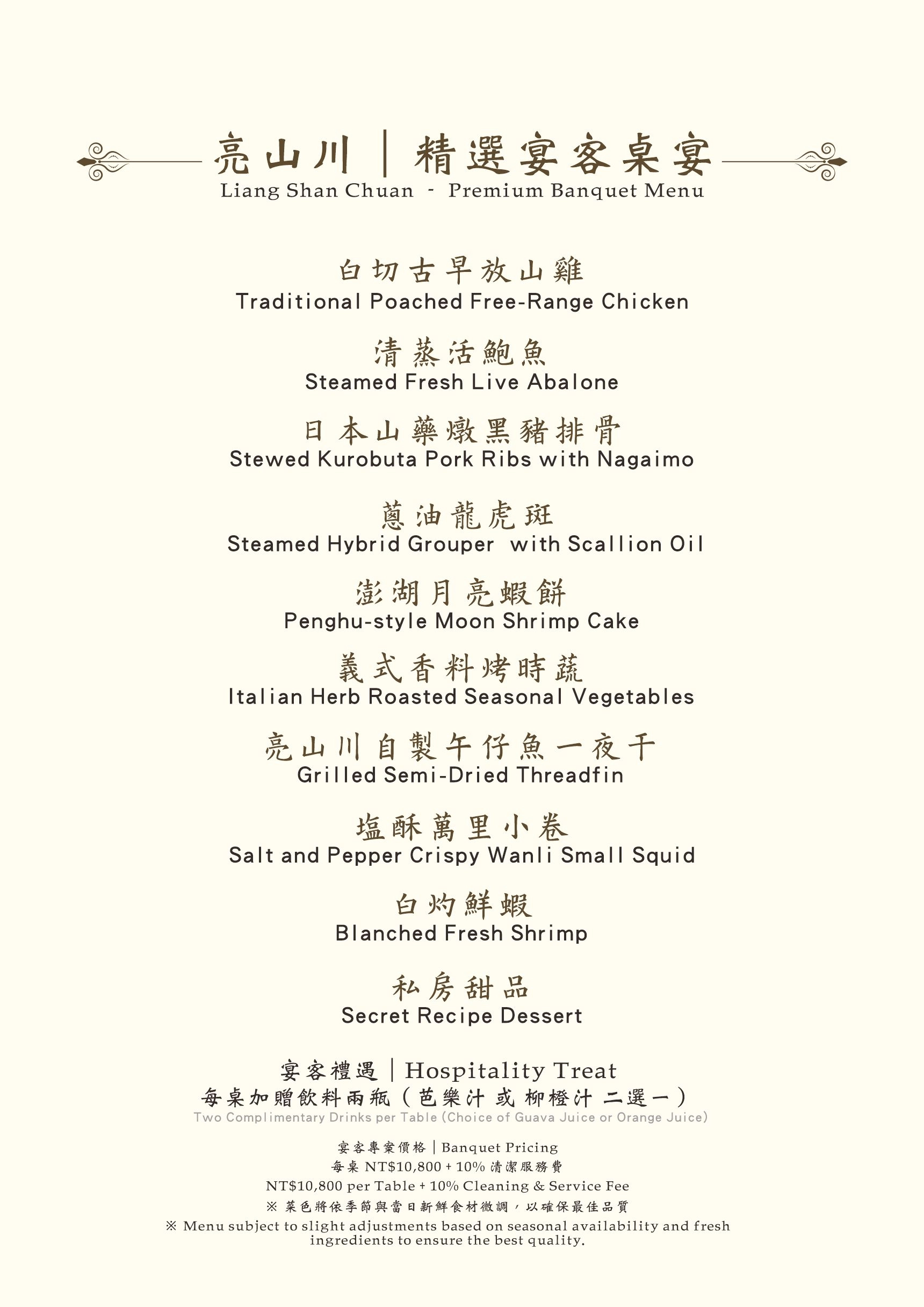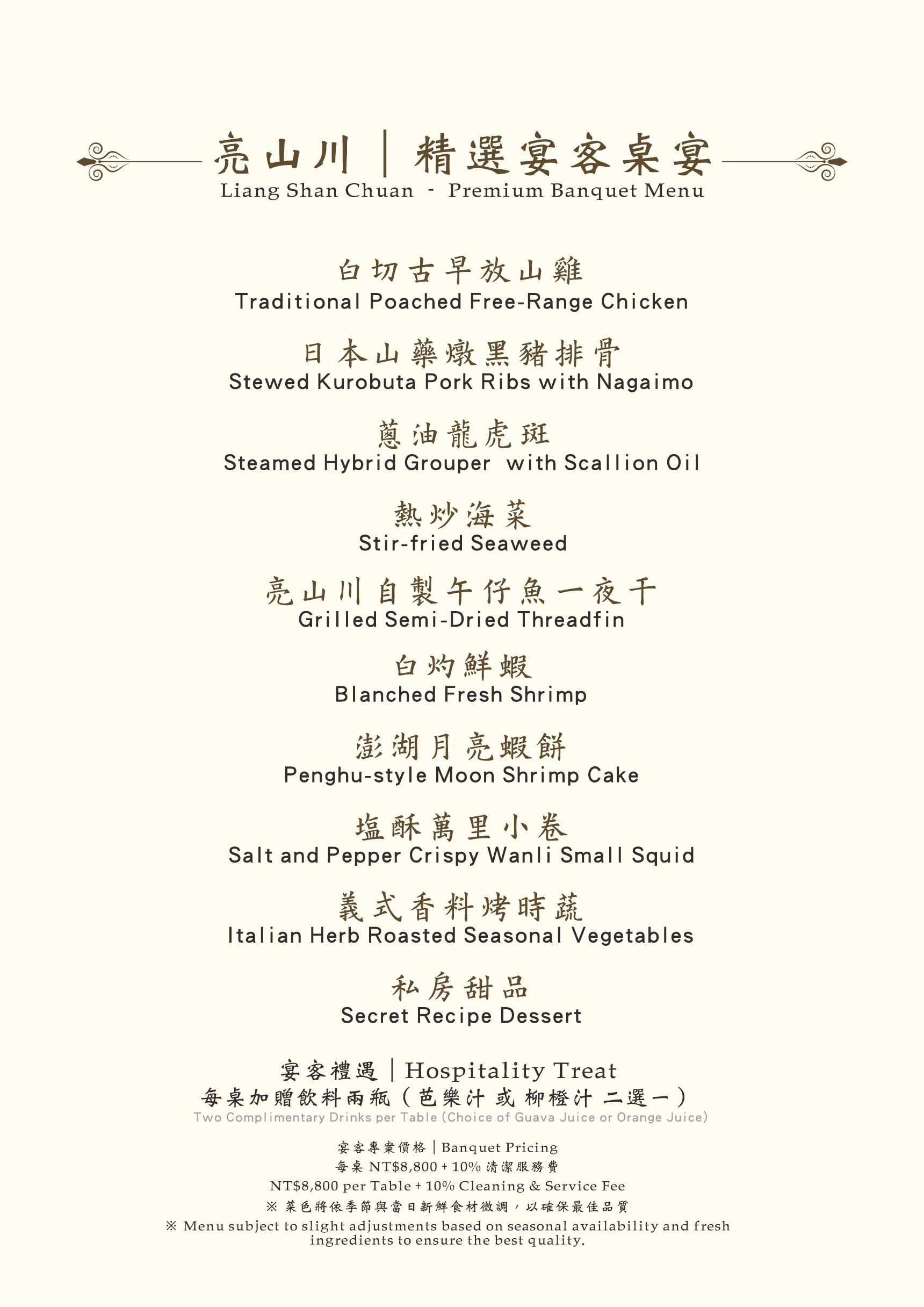 不論是家庭聚餐、朋友聚會、公司聚餐或慶生場合,亮山川都為您準備了豐富又實在的桌菜訂席服務!選用新鮮食材,用心料理每一道菜色,讓大家吃得開心又滿足,加上舒適寬敞的用餐環境,讓每一次相聚都更輕鬆自在,歡迎提前預約,帶著家人朋友一起來享受熱鬧又溫馨的用餐時光,留下滿滿美好回憶!